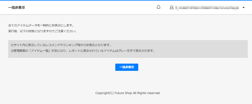 - 「一括非表示」操作時の商品は、以降、アイテム一覧・レコメンド表示枠にも表示されません。