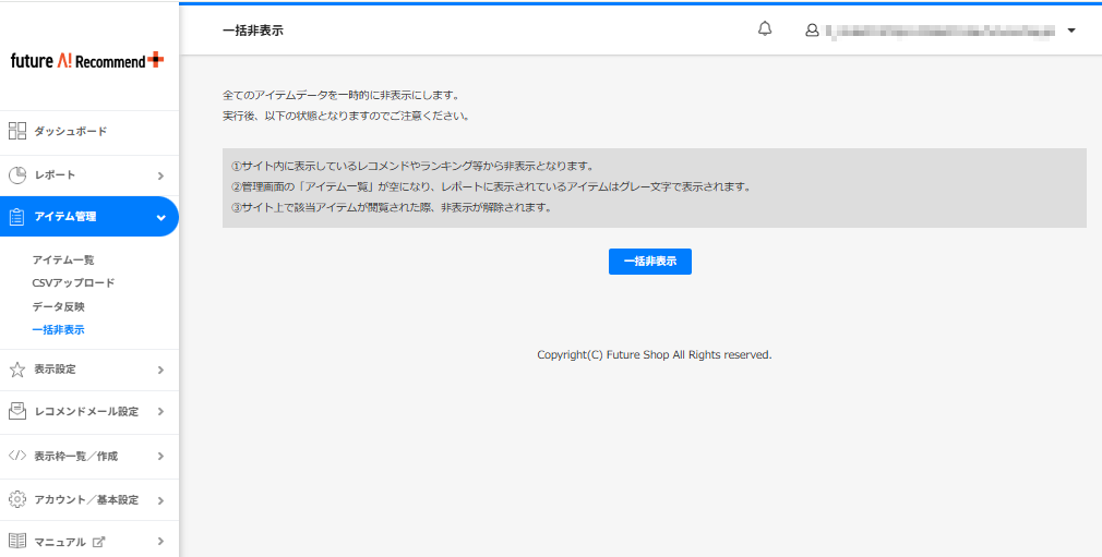 - future AI Recommend Plus管理画面 アイテム一覧からリアルタイムで全ての商品が非表示になります。