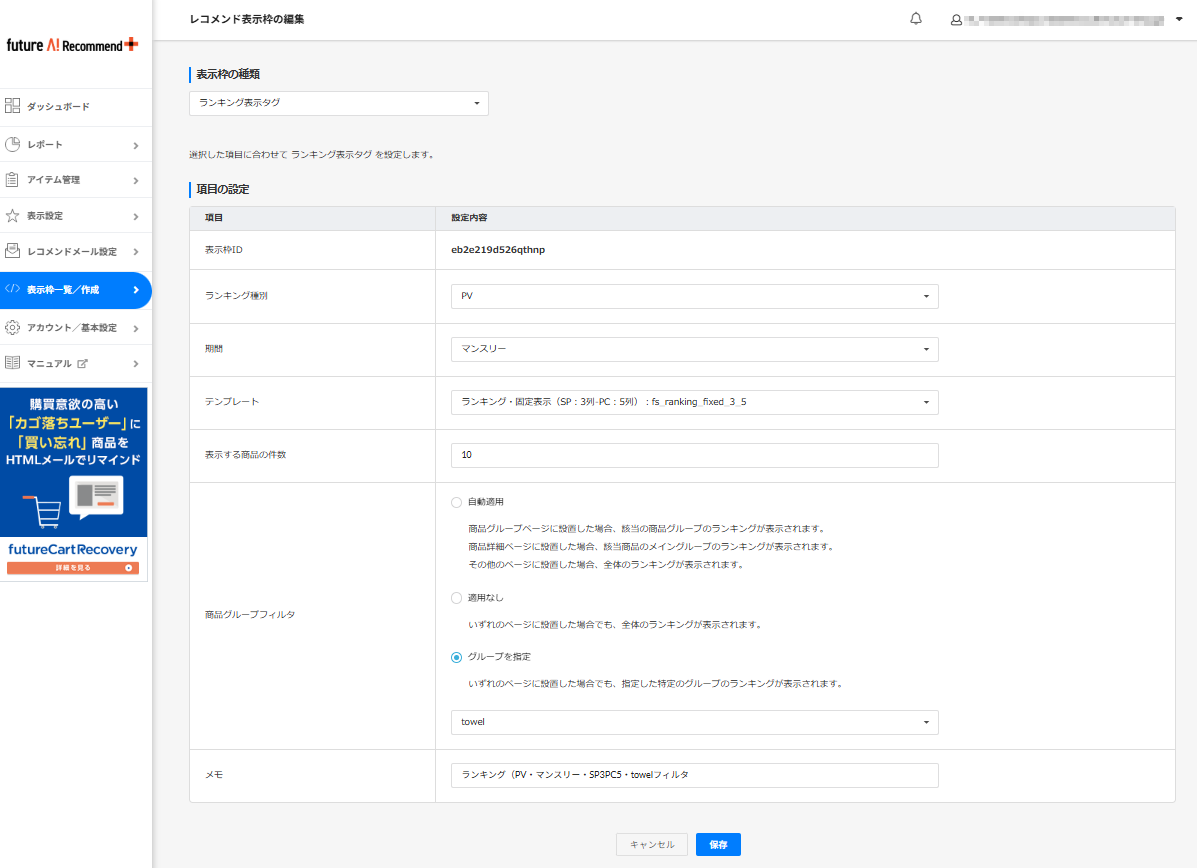 future AI Recommend Plus管理画面-レコメンド表示枠新規作成・編集