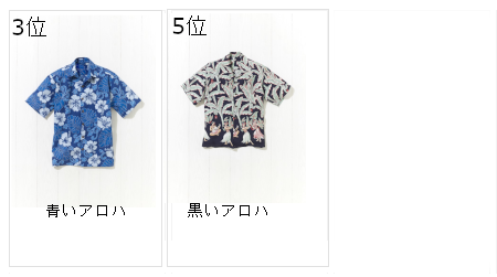 例)レコメンドアイテム(商品)が3位「青いアロハ」4位「黒いアロハ」5位「オレンジのアロハ」の場合